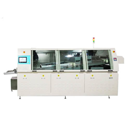 PCB dengan komponen yang terpasang secara otomatis dimasukkan ke dalam sistem konveyor rantai, melewati proses penyemprotan fluks, pemanasan awal, penyolderan gelombang, dan pendinginan sebelum keluar dari sistem.